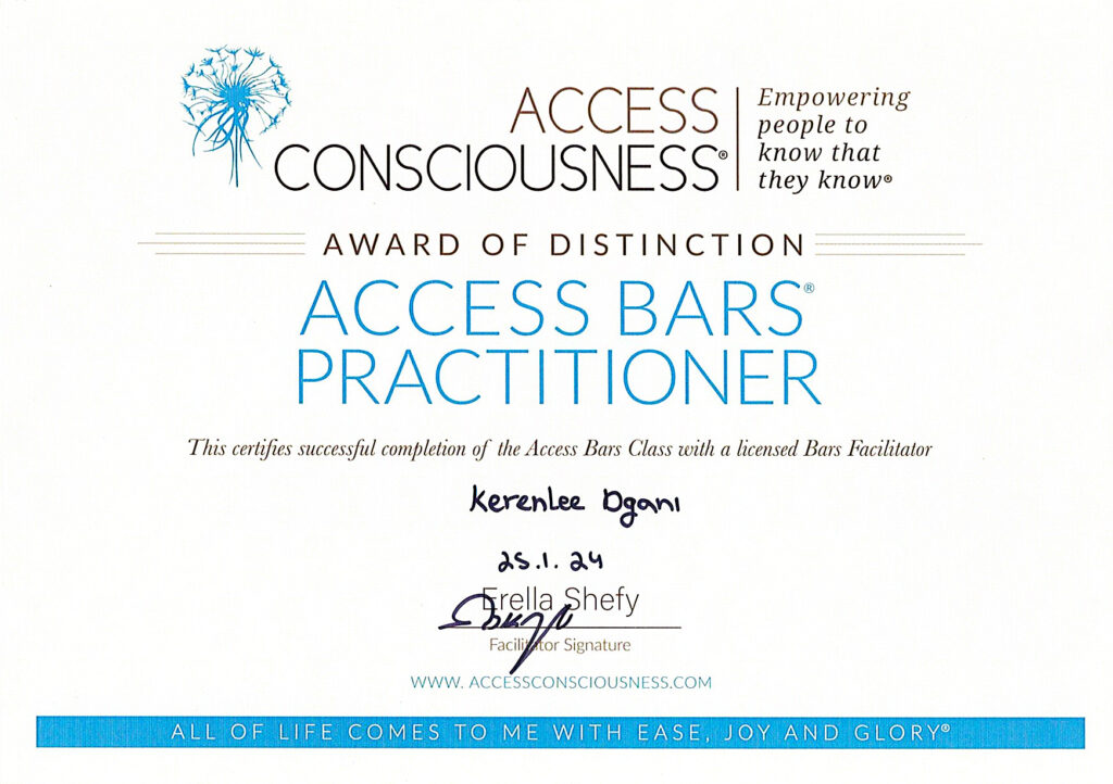 מתי לאחרונה חווית שקט מכל הפטפוט האינסופי שמתרוצץ לך בראש? מתי לאחרונה הרגשת תחושה של שמחה ואנרגיה מתפרצת? שיטת אקסס בארס הינה תהליך אנרגטי, שמבוסס על מגע ב- 32 נקודות בראש . כל נקודה מסמלת תחום בחיים וכל נגיעה מאפשרת לשחרר חסמים, להיפטר מדפוסים שמעכבים אותנו ולהפחית מתחים נפשיים ופיזיים. השיטה מאפשרת ליצור שינוי ברבדים שונים של החיים כמו כסף, תקשורת, מערכות יחסים, מיניות, גוף, ריפוי והגשמה. השיטה עובדת נהדר על בעיות של קשב וריכוז, חרדות וסטרס, מנקה את כל הרעשים בראש ויוצרת שקט ובהירות. איך יראו החיים שלכם ללא המחשבות המטרידות והדאגות שמכבידות עליכם?